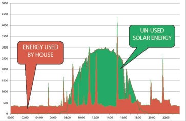 Grafico: curva di produzione giornaliera dell’impianto fotovoltaico e curva di consumo consumo domestico. In questo grafico gran parte della produzione viene immessa in rete. Con le batterie si riesce ad utilizzarla di sera e di notte.